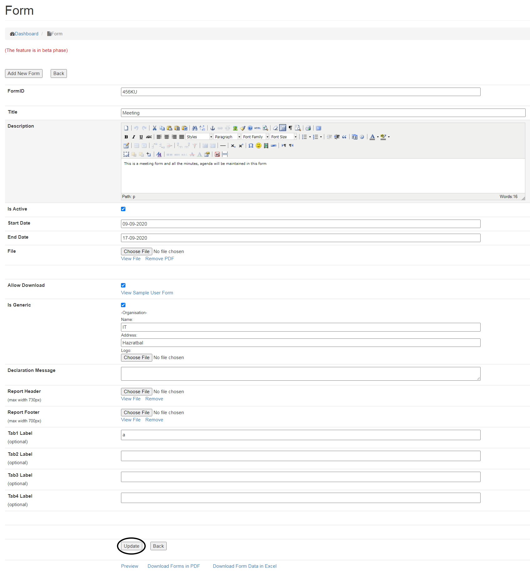 After having clicked on add form, you will see a screen with details that needs to be filled including:
