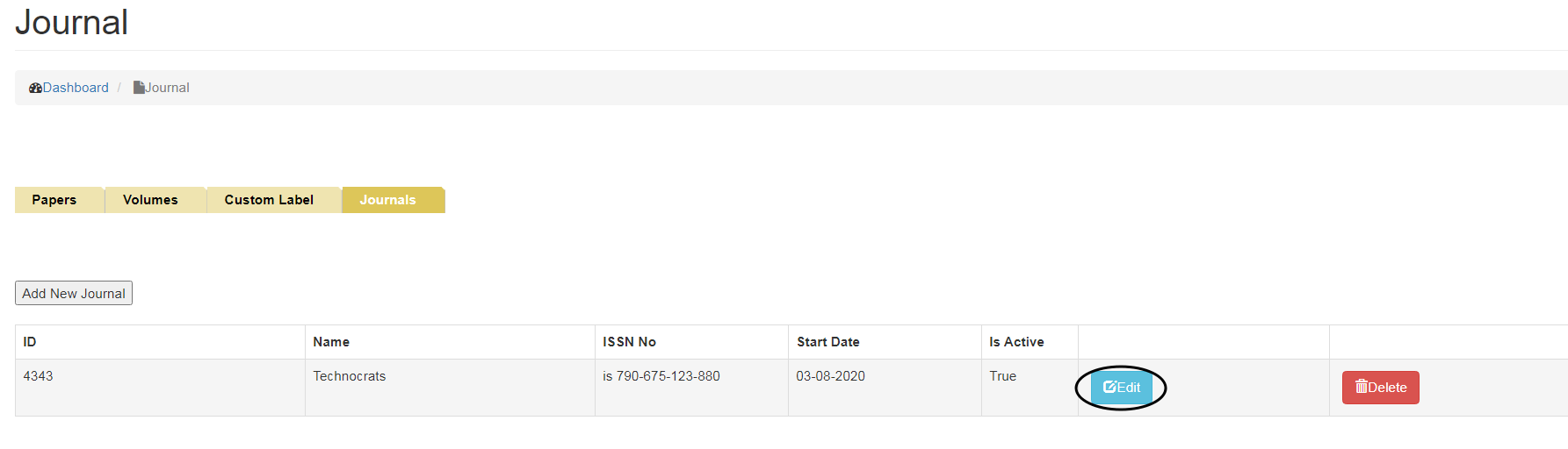To Add New Volumes, click on Volumes tab and select the Journal name from the drop down menu for which you want to add Volume.