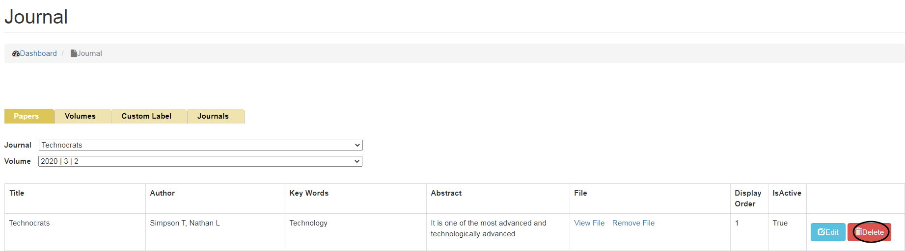 Next step is to add Papers, Click on Papers tab and select Journal and Volume from the drop down menu. Enter relevant details and click on Add button.